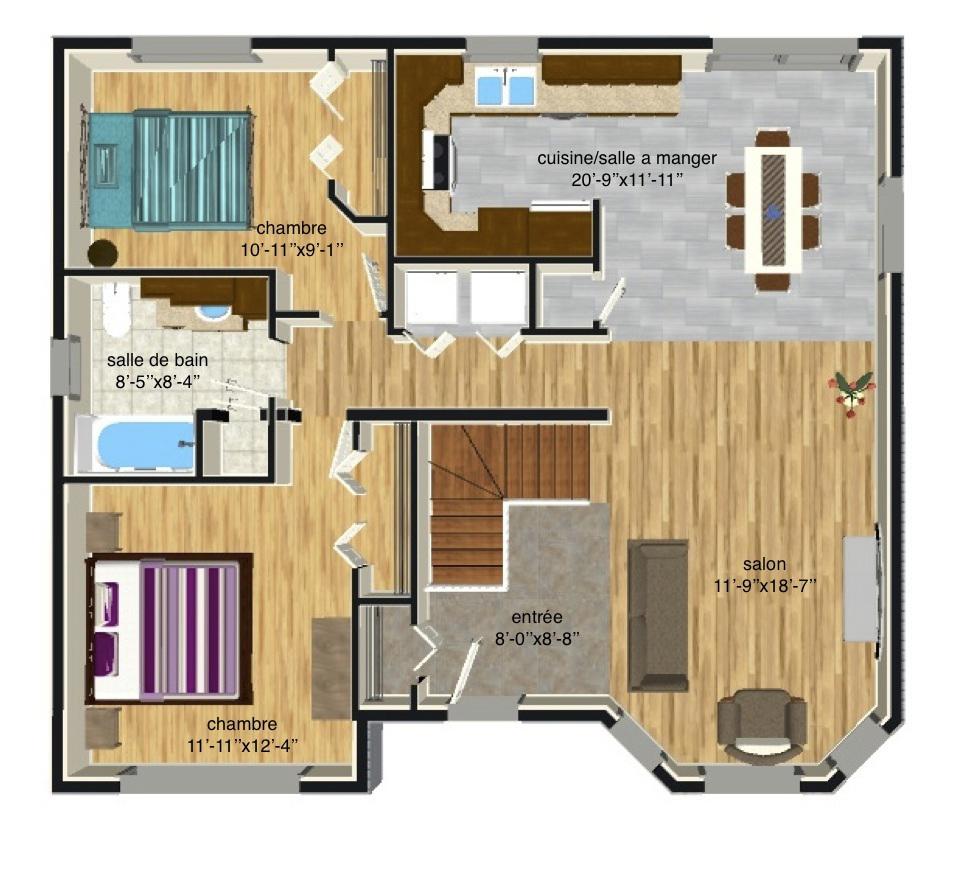 Modern bungalow design with a turret letting natural light into the kitchen and living room. Its two rooms, bathroom and laundry room located on the same floor will facilitate household chores. Customizable floor plan. Ideal for first-time buyers or young families.