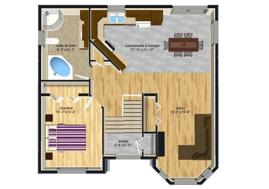 Beautiful modern split-level model with sober and minimalist lines. The front porch adds an interesting architectural element. The front door, at a lower level, gives you a well-lit private entrance.The open-concept kitchen, dining and living room is perfect for a family and friends get-together.