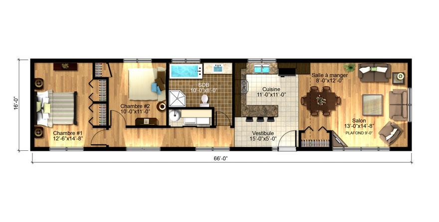 Unimodulaire conviviale avec un aménagement bien pensé. L’aire commune comprend le salon, la salle à manger et la cuisine. Le corridor assure une continuité entre les pièces principales, la salle de bain et les deux chambres. L’extérieur de cette unimodulaire démontre l’importance accordée aux détails, ce qui s’avère un atout de plus qui caractérise le charme de cette demeure.