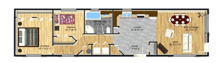 Unimodulaire compact, moderne et fonctionnel qui a été aménagé de façon intelligente afin d’assurer le confort des occupants dans chaque pièce. Le plan ouvert sur la cuisine, la salle à manger et le salon maximise l’espace et l’entrée de lumière. La salle de bain, la salle de lavage ainsi que les deux chambres à coucher sont accessibles par le couloir.