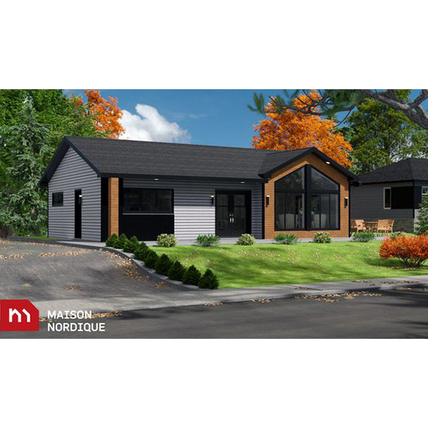 Voici notre modèle Nordet. Ce modèle de maison ou chalet dispose de 2 chambres. Les aires de vies communes offrent un effet de grandeur remarquable. Le plafond demi-cathédrale et la fenestration abondante du salon laissent pénétrer une superbe lumière naturelle. Un environnement idéal pour vos séances de yoga afin de vous ressourcer à la lumière du soleil.